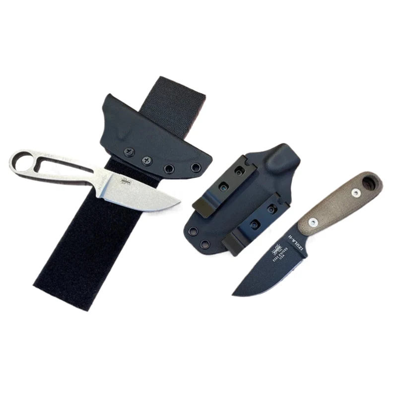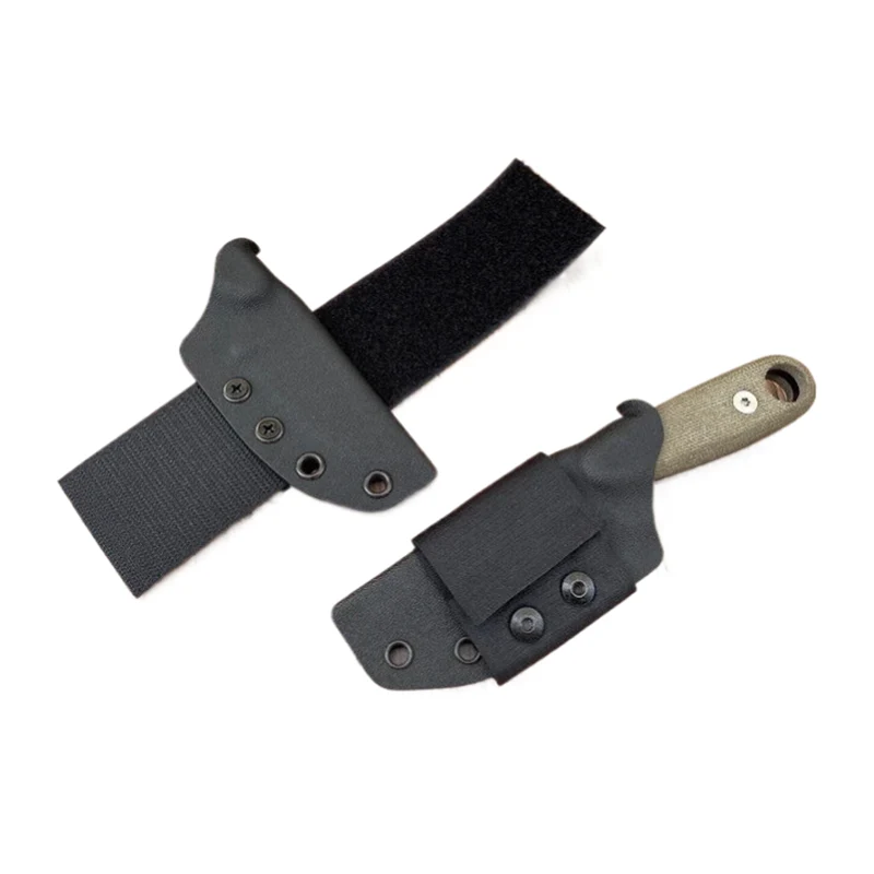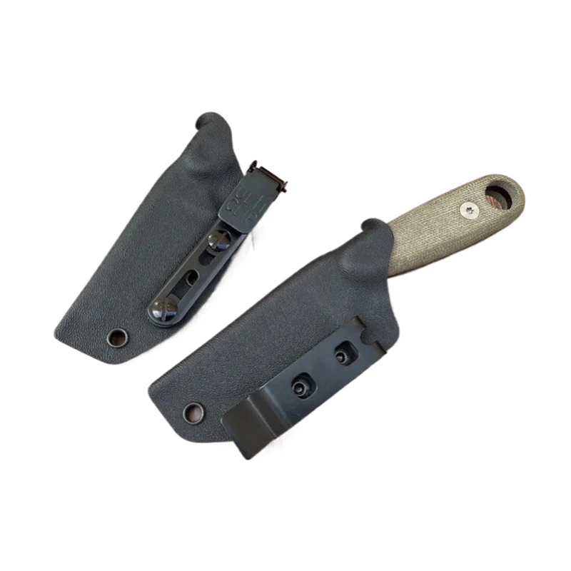 غلاف چاقو Kydex به صورت چشمک در یک طرف و چشمک در دو طرف موجود است. در صورت سفارش کلیپ، لطفاً مشخص کنید که کدام یک را می خواهید.